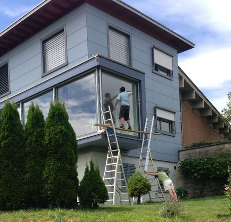 Das Bild zeigt zwei Männer, die wohl mal wieder die Fenster von außen reinigen sollten. Dazu verwendeten sie zwei Leitern, legten ein Brett auf die oberen Sprossen, um so eine Plattform zu erhalten. Offensichtlich ist es dem Mann, der oben arbeitet, dennoch nicht ganz geheuer, denn der zweite muss eine der beiden Leitern festhalten.