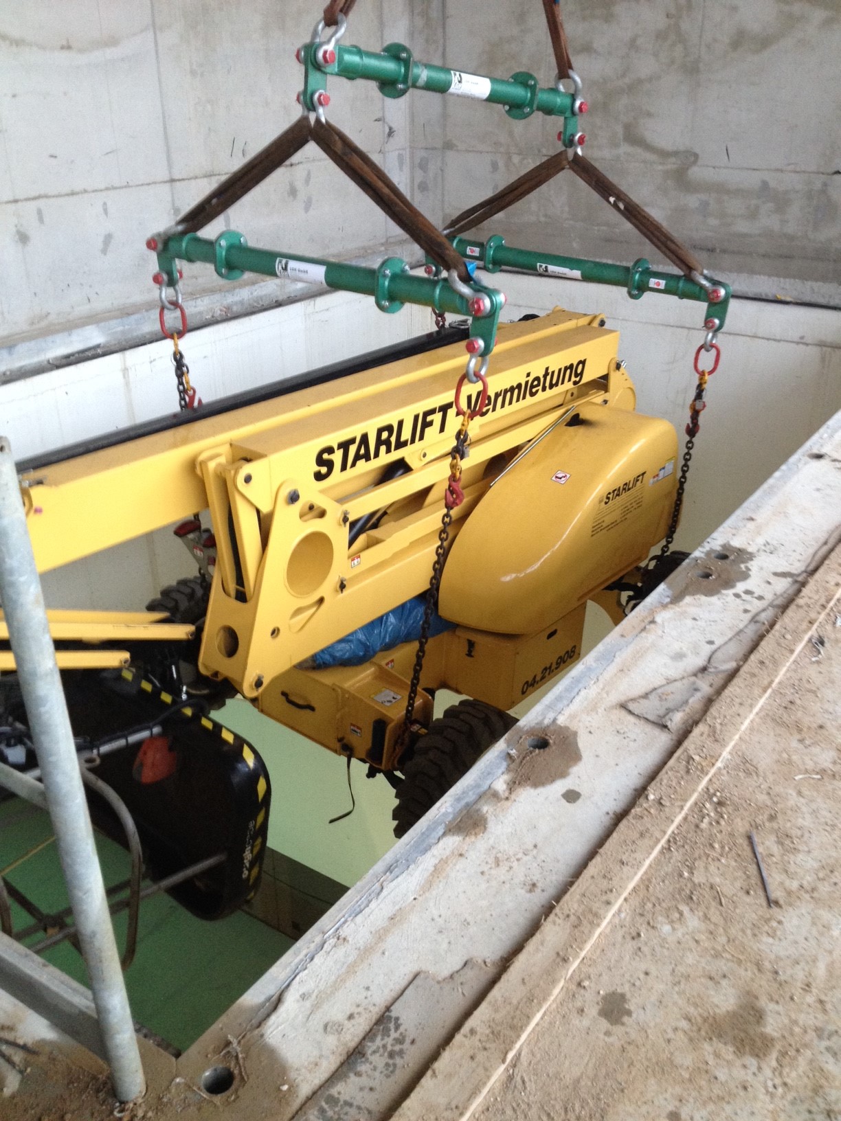 Das Gerät durfte dabei aber nicht breiter als 1,0 m sein und musste eine Traglast von 350 Kg in eine Arbeitshöhe von 12,0 m bringen. STARLIFT verfügt über die genau passenden Geräte für diese speziellen Anforderungen.