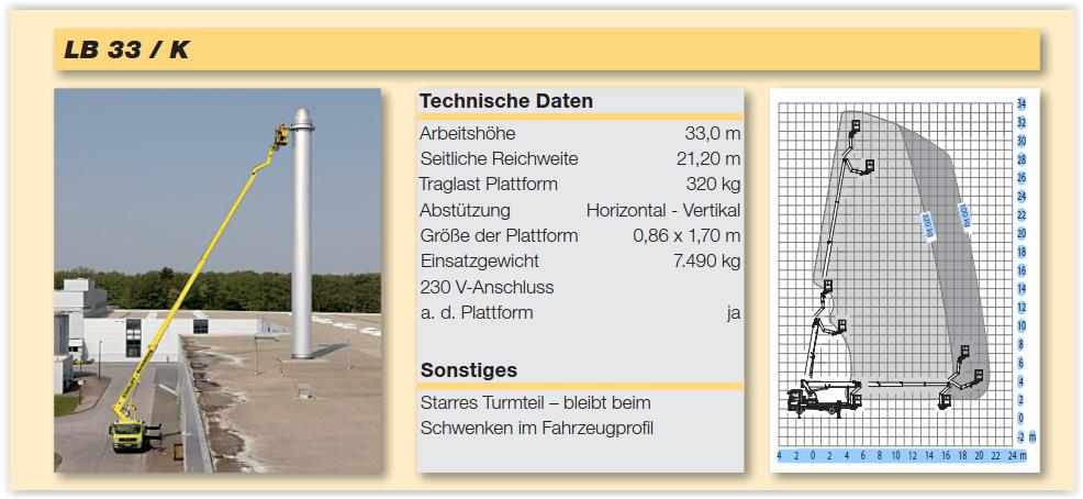 Der neue LB 33 / K von RUTHMANN markiert die Spitze der LKW-Arbeitsbühnen-Branche, wenn es um maximale Leistungsdaten und optimales Handling im Segment 7,49 t-Chassis geht. Die sensationelle Arbeitshöhe von 33 m gepaart mit einer seitlichen Reichweite von 21,2 m erklärt den Nutzen, von dem zum Beispiel Garten- und Landschaftsbauer, Gebäudereiniger und Handwerker profitieren können. Mit dem T 330 stoßen Sie in Arbeitsbereichsregionen vor, die sonst nur mit Großgeräten möglich sind. Dabei ist er einfach zu bedienen, was auch den Aufwand für Einweisungen auf ein Minimum reduziert.