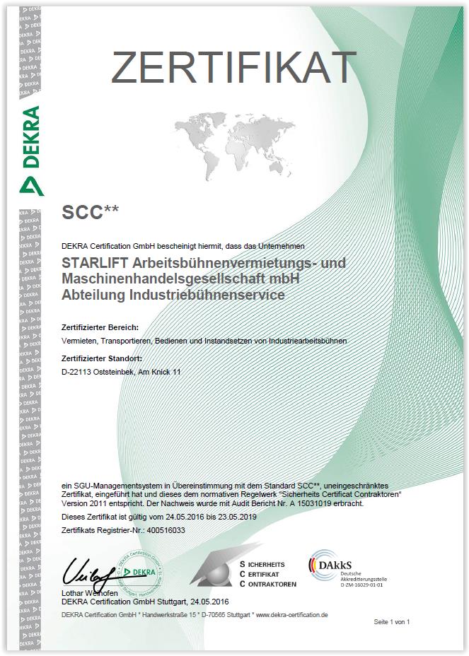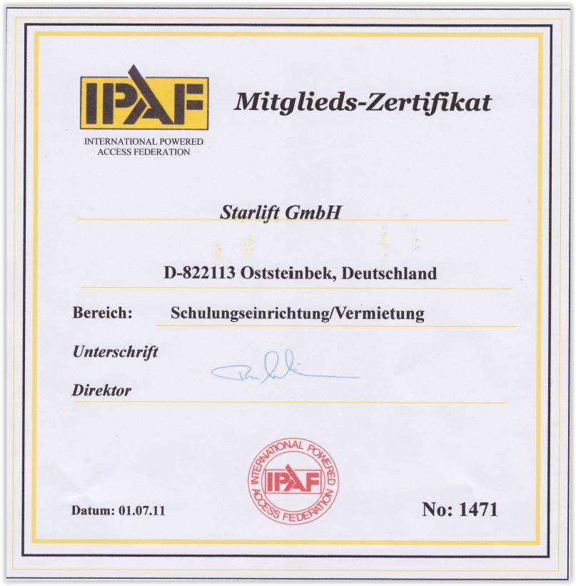 Die STARLIFT GmbH selbst ist seit 2010 als IPAF – Schulungszentrum und seit 2016 nach SCC (Sicherheitsmanagement System für Arbeitsschutz) zertifiziert.